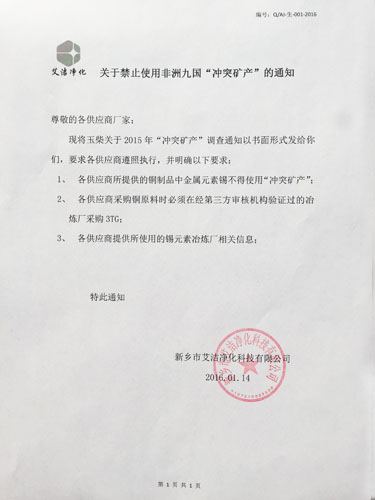 關于禁止使用非洲九國沖突礦產的通知 我公司提出關于禁止使用非洲九國沖突礦產的通知,請各供應商嚴格按照要求實施!